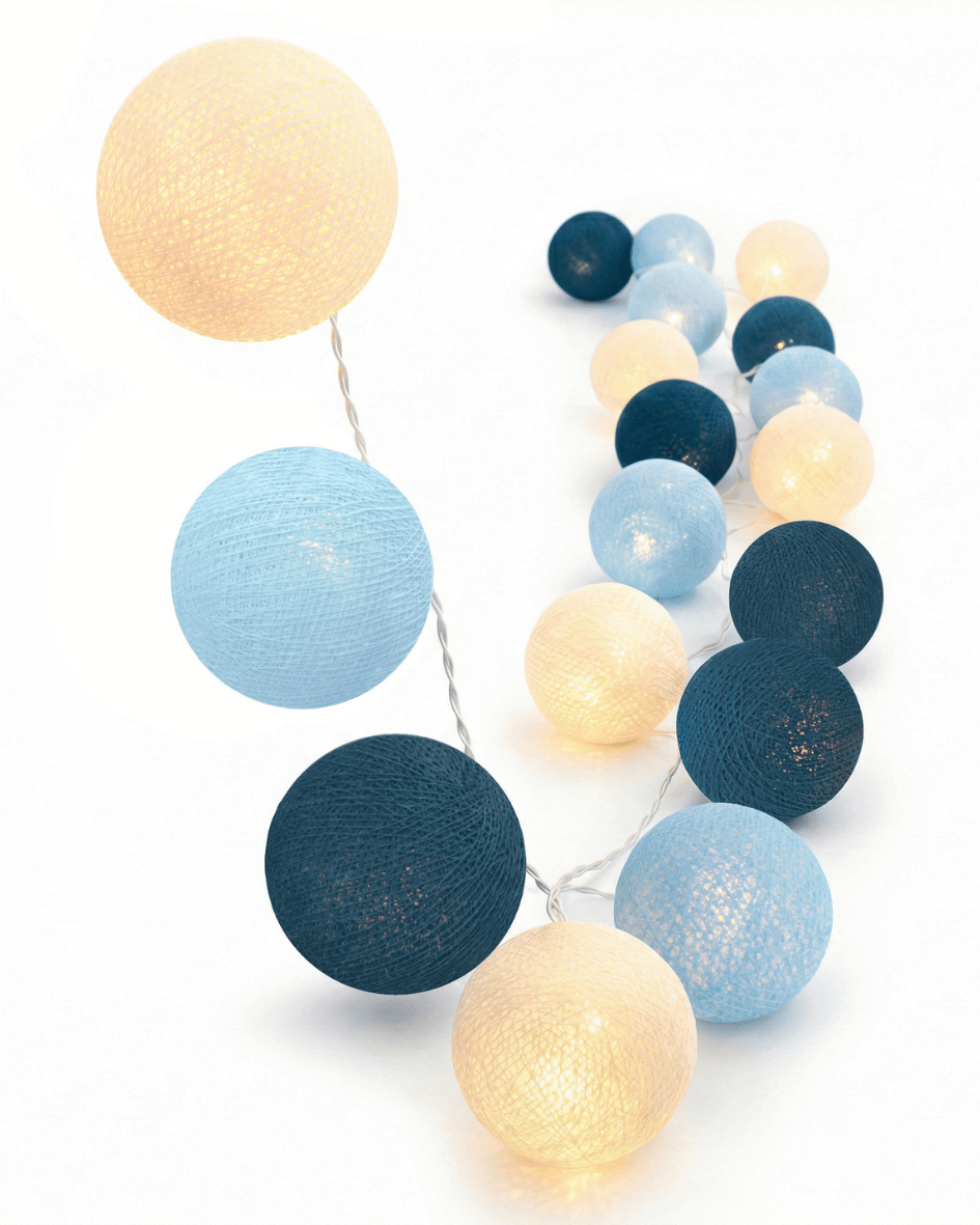 The cotton balls, in shades of cream, light blue, and navy blue, are attached to a delicate, string-like cable. Small LEDs beneath each cotton ball provide the illumination, with a lifespan 20 times longer than traditional bulbs and an impressively low energy consumption of just 0.4 watts. This results in electricity costs of just 5 euros per year with daily 5-hour usage. A practical bonus is that the lights emit no heat.